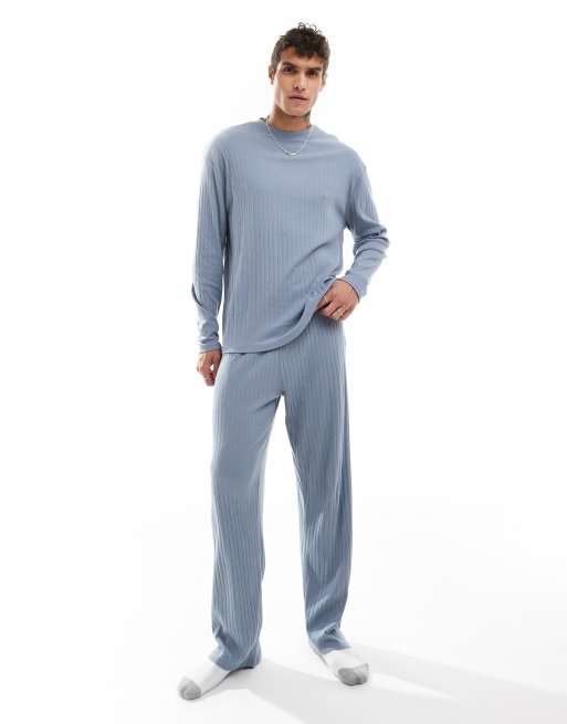 ASOS DESIGN - Set da casa con maglietta a maniche lunghe e pantaloni blu a coste