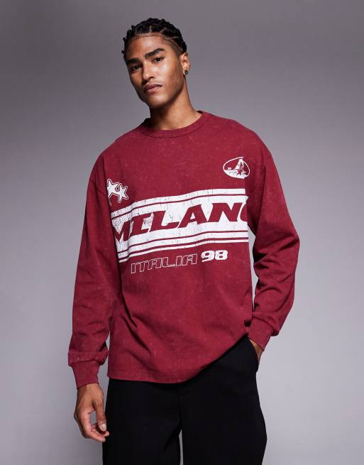 ASOS DESIGN - T-shirt a maniche lunghe pesante comoda rosso slavato con grafica sportiva Milano