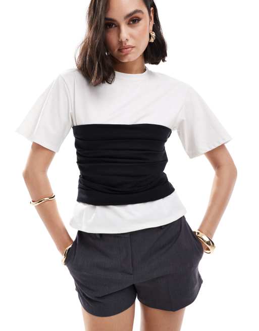 ASOS DESIGN - T-shirt aderente nera e bianca con elastico in vita