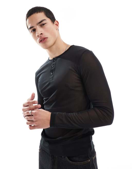 ASOS DESIGN - T-shirt attillata a maniche lunghe nera in rete con collo serafino