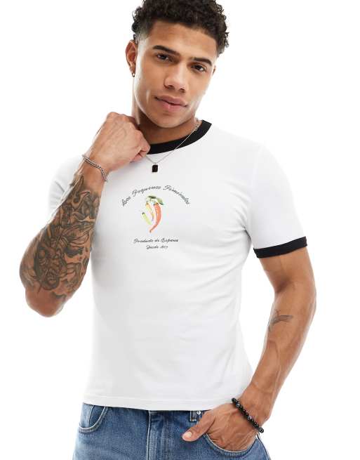 ASOS DESIGN - T-shirt attillata bianca con bordi a contrasto e stampa di peperoncino sul petto