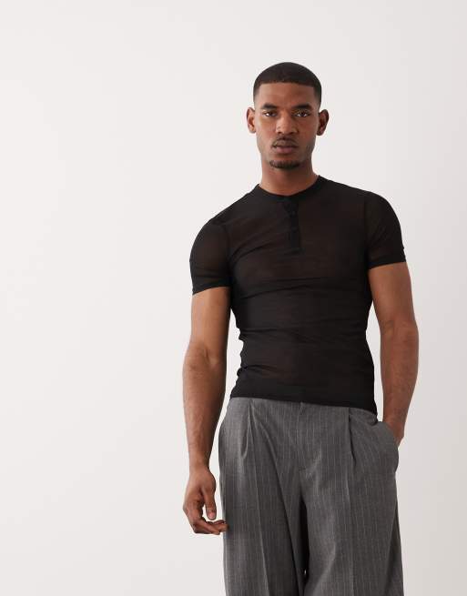 ASOS DESIGN - T-shirt attillata in rete nera a coste con scollo serafino