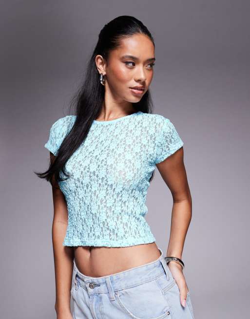 ASOS DESIGN - T-shirt baby blu a maniche corte in pizzo trasparente