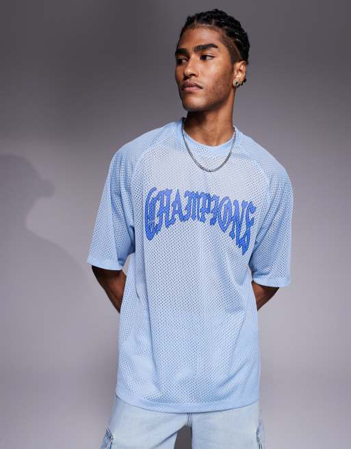 ASOS DESIGN - T-shirt comoda in airtex blu con grafica "Champions" e maniche raglan