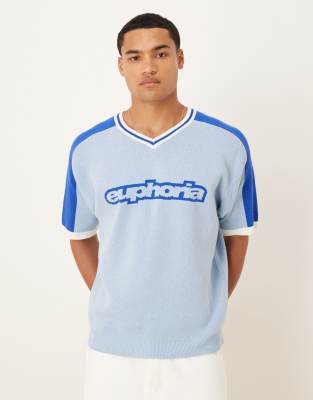 ASOS DESIGN - T-shirt comoda lavorata azzurra con grafica "Euphoria" e scollo a V