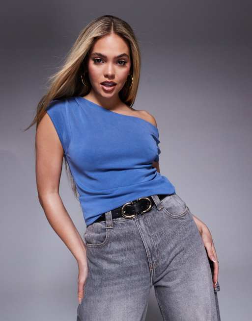 ASOS DESIGN - T-shirt in cupro blu con spalle scoperte