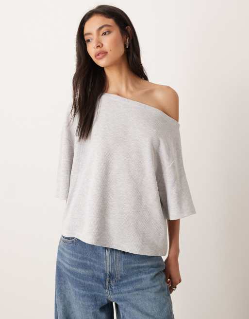 ASOS DESIGN - T-shirt in tessuto a nido d'ape color grigio mélange con spalla scoperta