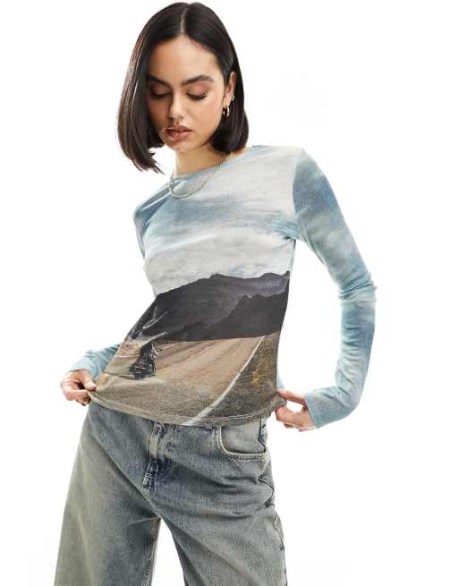 ASOS DESIGN - T-shirt mini a maniche lunghe in rete con stampa fotografica di paesaggio