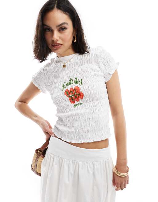ASOS DESIGN - T-shirt mini bianca arricciata con grafica "Tomato Girl"