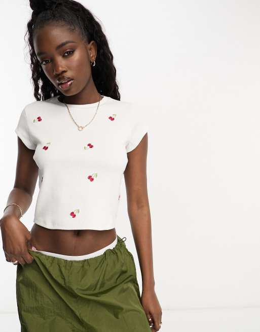 ASOS DESIGN - T-shirt mini bianca con ciliegie ricamate