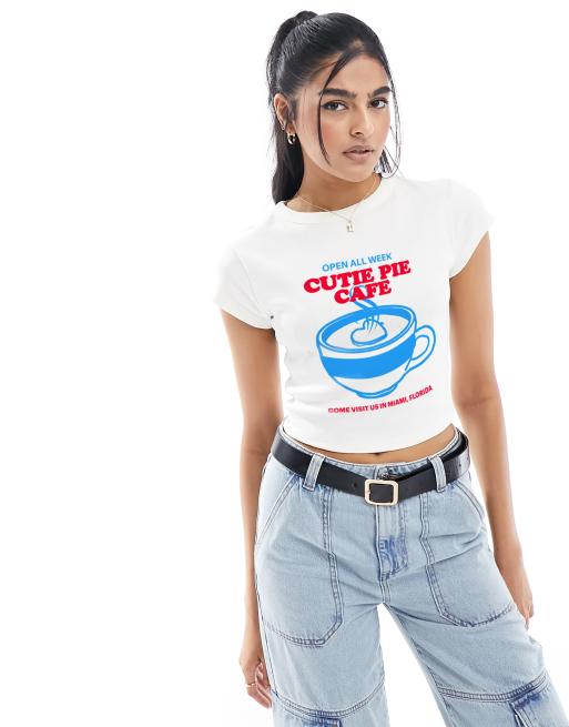 ASOS DESIGN - T-shirt mini color crema a coste con grafica "Cutie Pie Cafe"