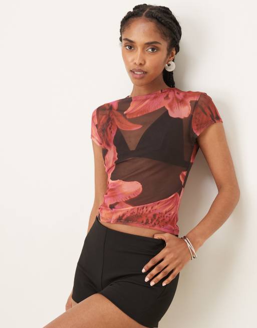 ASOS DESIGN - T-shirt mini in rete trasparente rosa a fiori