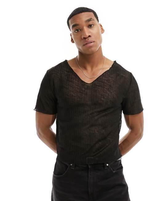 ASOS DESIGN - T-shirt nera trasparente con scollo a V