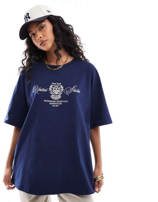 ASOS DESIGN - T-shirt oversize blu navy con ricamo écru