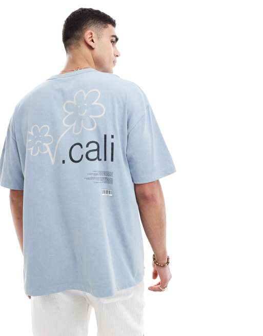 ASOS DESIGN - T-shirt oversize blu slavato con stampa sul retro con fiori e scritta "California"