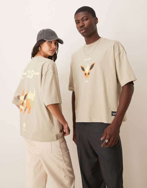 ASOS DESIGN - T-shirt squadrata oversize unisex grigio slavato con stampa Pokemon di Flareon