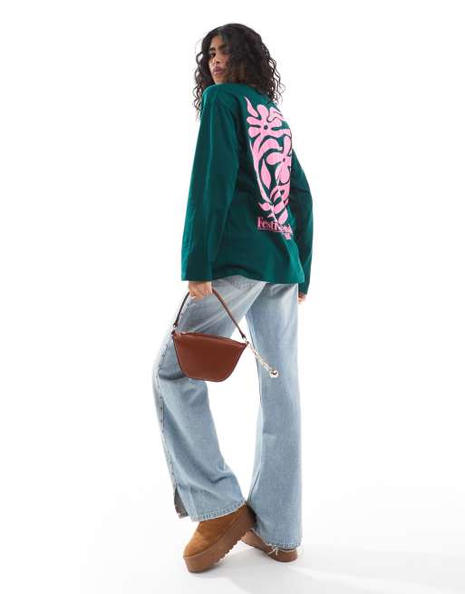ASOS DESIGN - T-shirt stile skater a maniche lunghe verde con fiore