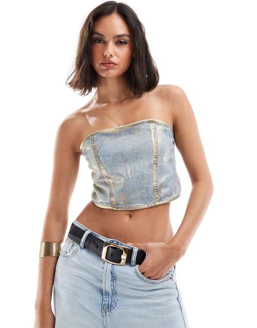 ASOS DESIGN - Top a fascia in denim foglia d'oro metallico
