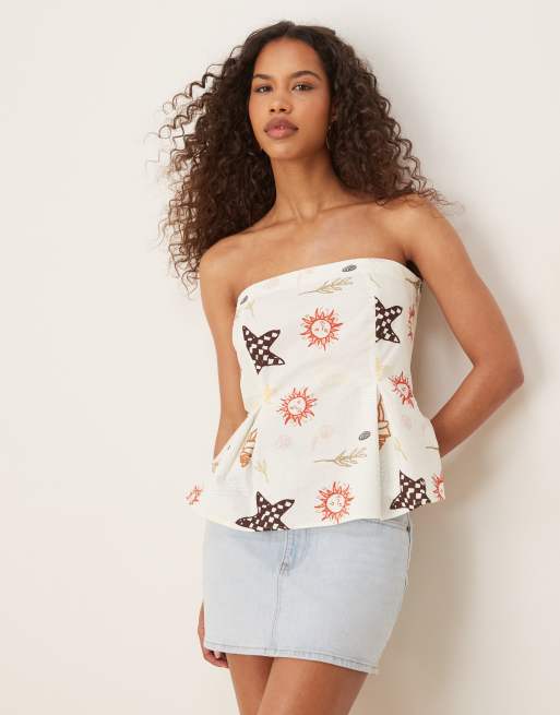 ASOS DESIGN - Top a fascia stretto in vita in misto lino con stampa a tema vacanza in coordinato