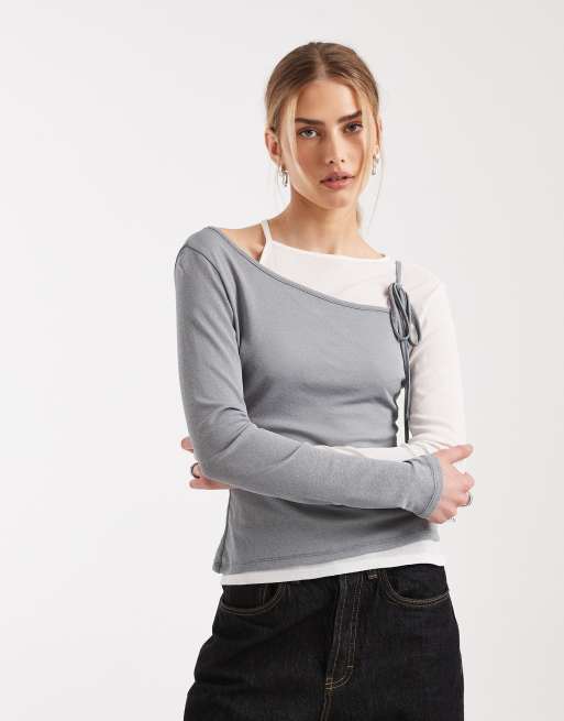 ASOS DESIGN - Top a maniche lunghe a doppio strato a coste color crema e grigio con laccetti