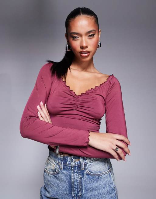 ASOS DESIGN - Top a maniche lunghe bordeaux con arricciature e orli smerlati