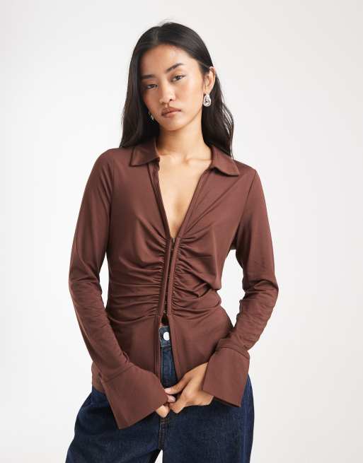 ASOS DESIGN - Top a maniche lunghe in cotone a coste color cioccolato con scollo quadrato e gancetti