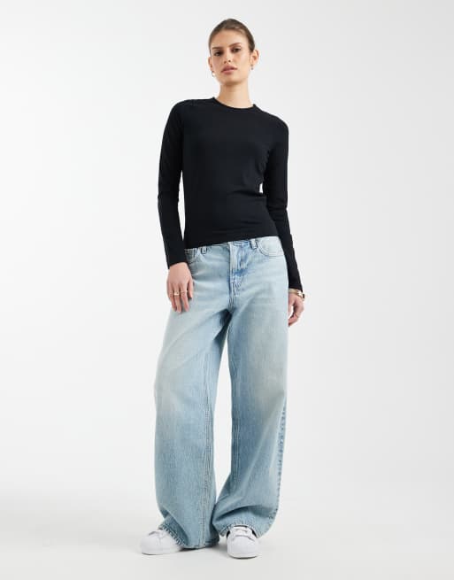 ASOS DESIGN - Top a maniche lunghe in cotone nero con scollo rotondo