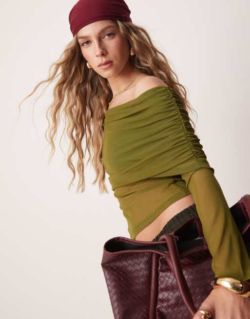 ASOS DESIGN - Top a maniche lunghe in rete color oliva con scollo risvoltato ampio