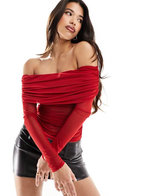 ASOS DESIGN - Top a maniche lunghe in rete rosso con scollo ampio alla Bardot