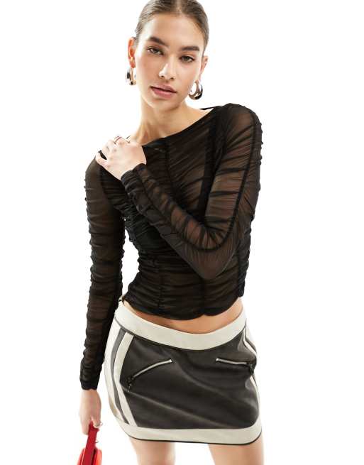ASOS DESIGN - Top a maniche lunghe nero in rete con scollo a barchetta