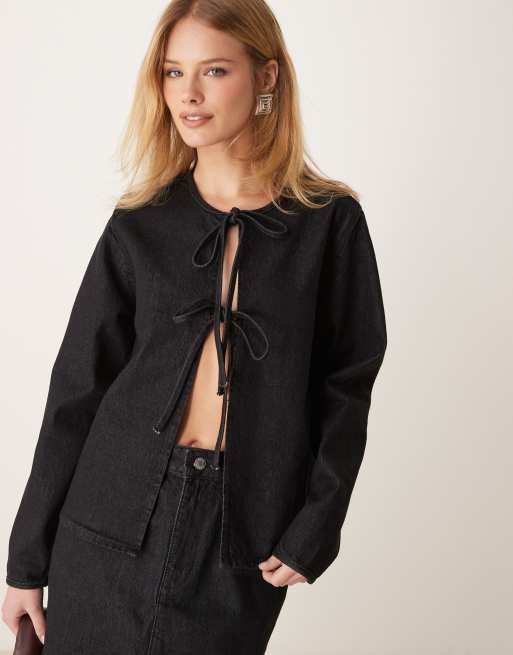 ASOS DESIGN - Top a maniche lunghe nero slavato allacciato sul davanti in denim