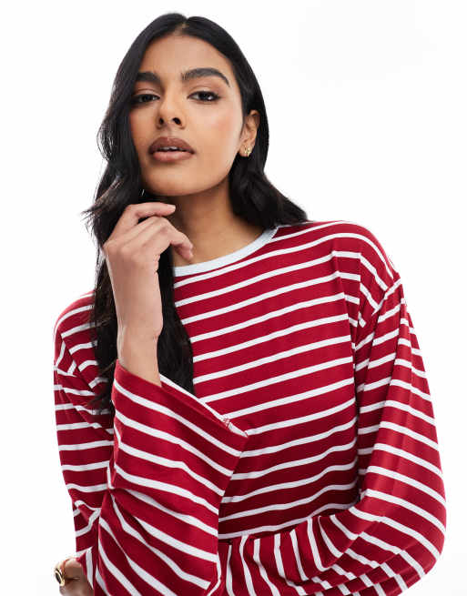 ASOS DESIGN - Top a maniche lunghe rosso a righe con finiture a contrasto sul collo