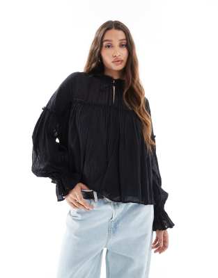 ASOS DESIGN - Top a maniche lunghe stile grembiule nero stropicciato allacciato sul collo e con volant