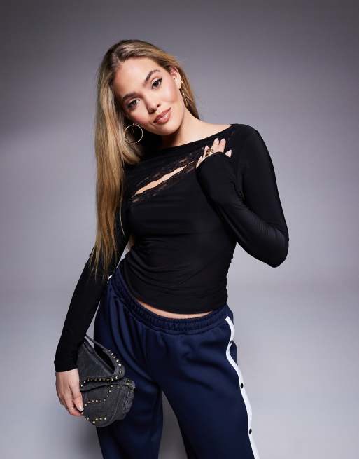 ASOS DESIGN - Top aderente a maniche lunghe nero con cut-out in pizzo