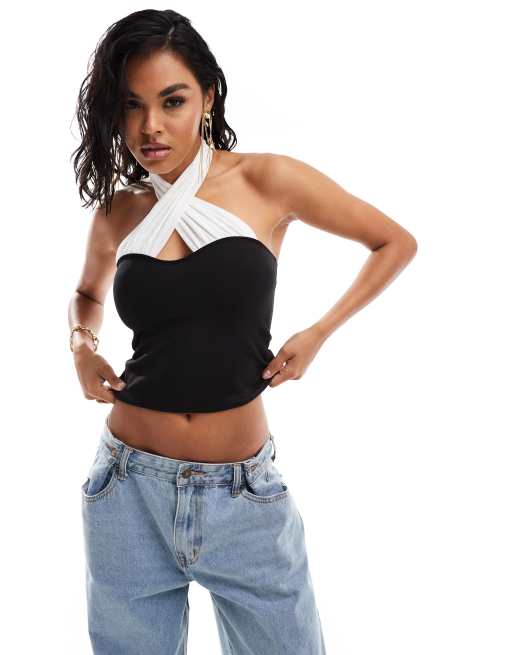 ASOS DESIGN - Top aderente nero con incrocio in rete bianca a contrasto