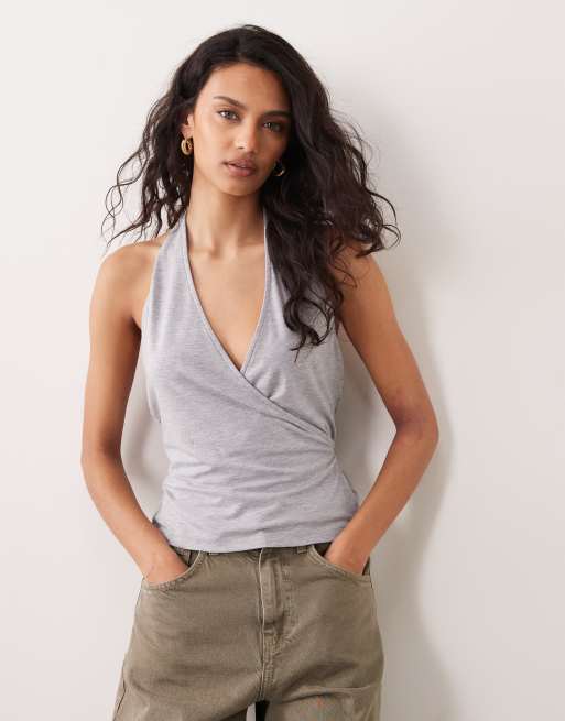 ASOS DESIGN - Top allacciato al collo a portafoglio grigio mélange con laccetti