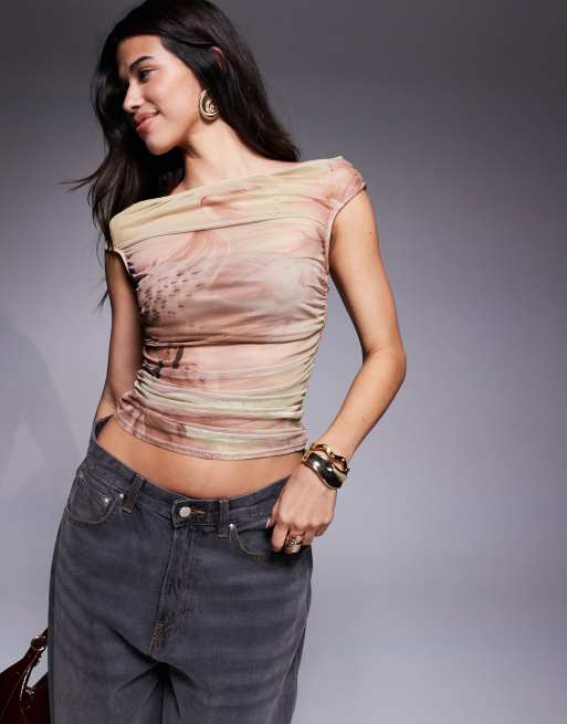 ASOS DESIGN - Top arricciato in rete con spalle scoperte e stampa floreale oversize