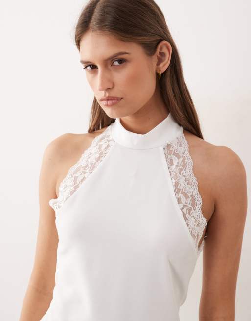 ASOS DESIGN - Top bianco allacciato al collo con finiture in pizzo