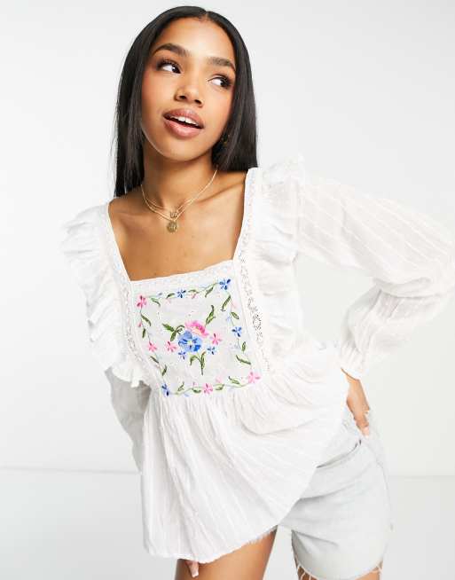 ASOS DESIGN - Top bianco con scollo squadrato e ricami allacciato sul retro