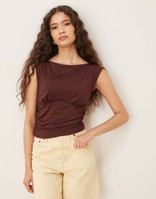 ASOS DESIGN - Top color cioccolato con cucitura sotto il bustino e scollo a barchetta