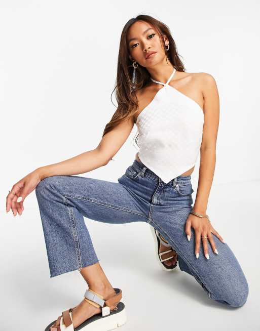 ASOS DESIGN - Top con fondo a punta allacciato al collo avorio a fiori jacquard