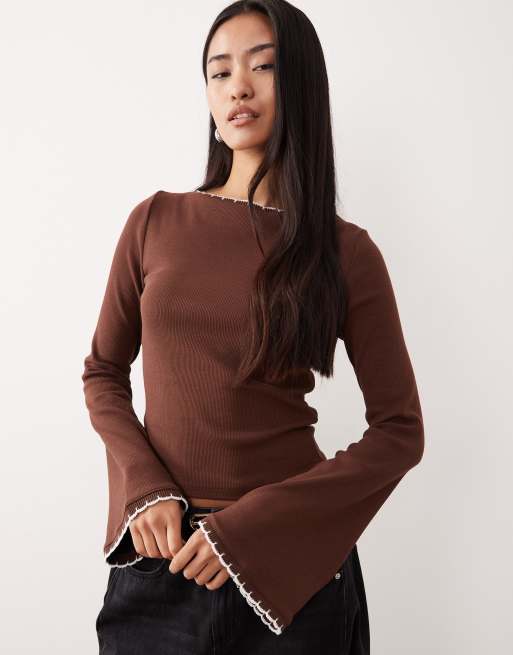 ASOS DESIGN - Top con maniche svasate a costine con bordi smerlati marrone
