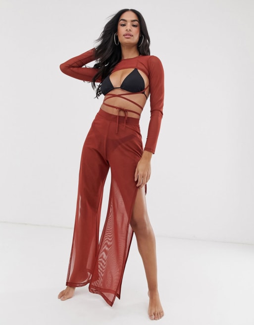 ASOS DESIGN - Top da mare super corto a rete in jersey marrone con stringhe in vita in coordinato