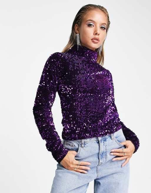 ASOS DESIGN - Top dolcevita a maniche lunghe in paillettes viola