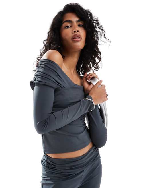 ASOS DESIGN - Top grigio ardesia con scollo Bardot risvoltato in coordinato