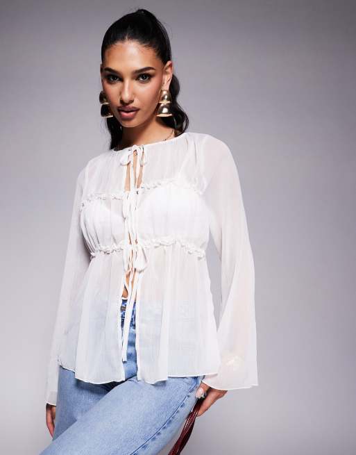 ASOS DESIGN - Top in chiffon arricciato écru con lacci