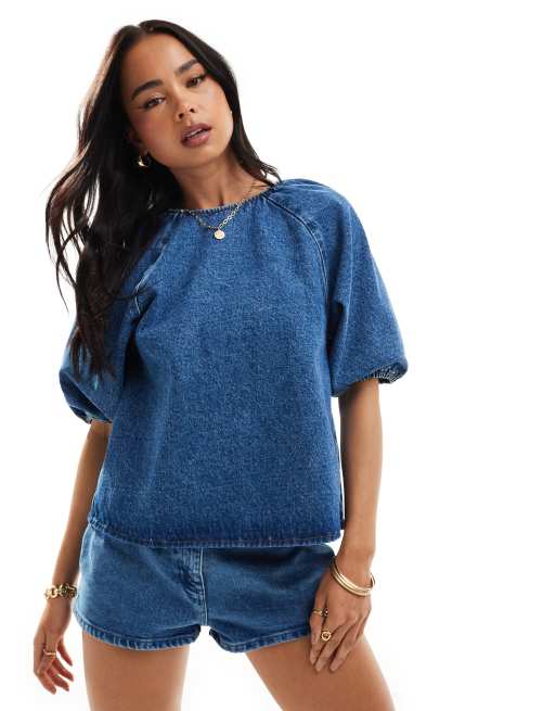 ASOS DESIGN - Top in denim blu medio con maniche raglan a sbuffo