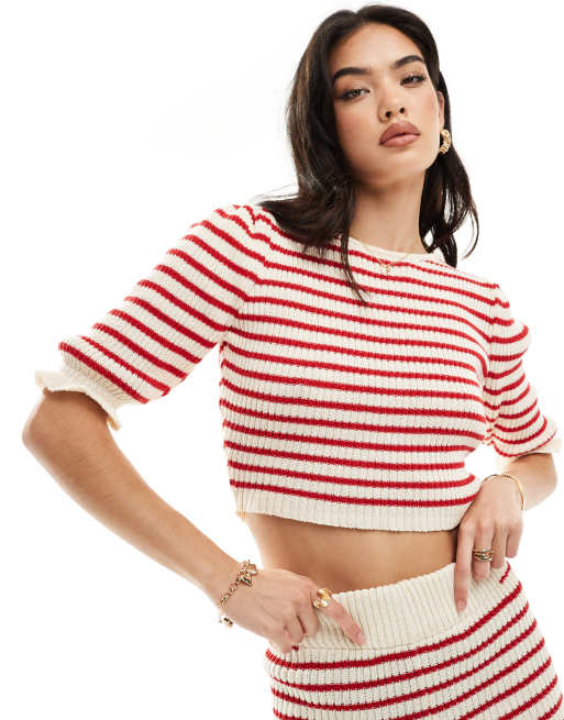 ASOS DESIGN - Top in maglia a righe monocromatico con maniche con volant in coordinato