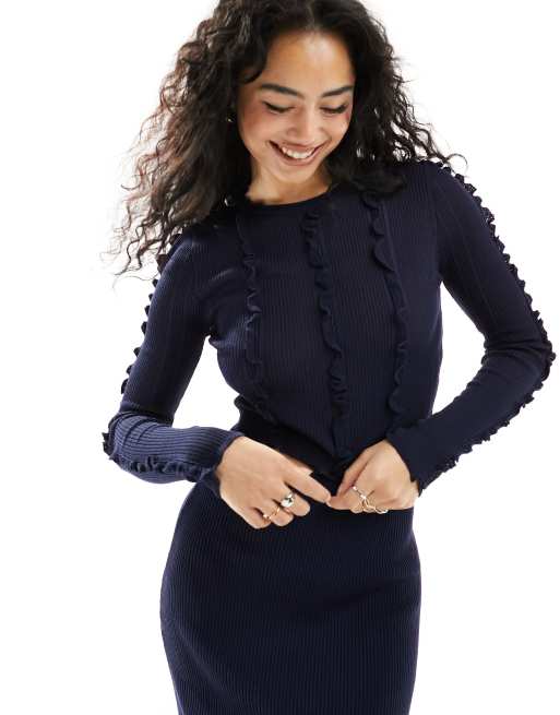 ASOS DESIGN - Top in maglia blu navy con volant e cuciture in coordinato