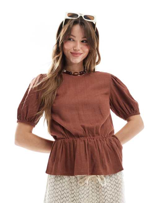 ASOS DESIGN - Top in misto lino marrone con maniche a sbuffo e peplo